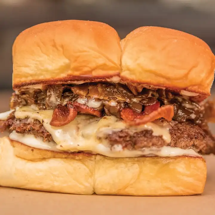 Creekstone Farms Black Angus patty with white American, smoked bacon, caramelized onions & garlic aioli—massive flavor powering a hearty lunch and dinner.