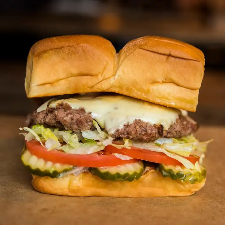Creekstone Farms all‑natural 100% Black Angus beef patty with white American, pickles, lettuce, tomato, onion & secret sauce—classic comfort for all‑American lunch or nostalgic dinner.