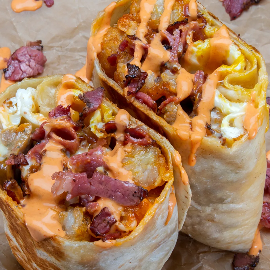 3 eggs, smoked bacon, white American, crispy tots, caramelized onions & spicy mayo wrapped tight—hearty breakfast hero, sustaining lunch, comfort dinner.